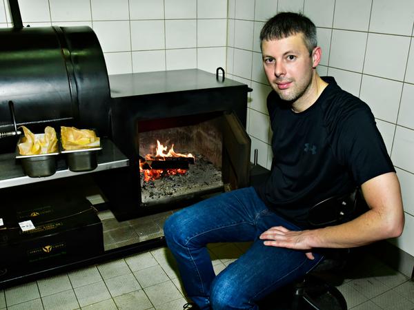 „Es ist mehr als Essen, das steht schon mal fest“, sagt der gebürtige Texaner zum Thema Barbecue und legt ein paar Eichenholzscheite nach. Heiß ist es in dem kleinen, weiß gekachelten Hinterzimmer des Ecklokals. Die trockene Luft lässt die Haut spannen, es riecht nach Rauch, sanft knistert das Feuer. Schon seit 4.30 Uhr lodert hier, in Wedding am Leopoldplatz, die Glut. Um fünf Uhr hat dann der kleine Ofen am Frontende des Pits für ordentlich Hitze gesorgt und sie in den gewölbten Rauchkammern verteilt. Brandi legt als erstes die imposanten Briskets auf den Rost: Rinderbruststücke, mit Salz und grob gemahlenem Pfeffer gewürzt. Dann passiert erstmal ... wenig. Jedenfalls nichts, was man sehen könnte. „Ein gutes Barbecue braucht Holz, Feuer und Zeit“, sagt der Pitmaster.
