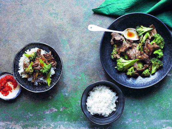 Brokkoli, übrige Sojasauce (1 TL) und Austernsauce dazugeben. Alles gründlich mischen und noch heiß mit gedämpftem Reis servieren.