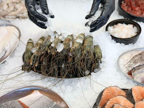 Kein Wunder also, dass schon die Auslage bezirzt: Erkennbar frischer Fisch, im Ganzen und filetiert, durchweg aus dem Meer, dazu Austern. Snapper, Adlerfisch, Kabeljau, Wolfsbarsch, Thun, als Blickfang meist auch ein großer Steinbutt, „4700g 285 Euro“ steht dann beispielsweise an der Tafel, das ist ein in Berlin sonst nicht übliches Angebot. Auch alle Filets werden nach Gewicht verkauft, was pro 100 Gramm zwischen zehn und 20 Euro kostet.