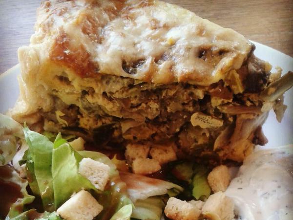 Die arabische Suppe ist eine der rustikalen Art und von sehr angenehmer Fruchtigkeit und Süße. Was die Gewürze angeht, könnte man den Mix aus Tomaten, Karotten und Erbsen jedoch ebenso problemlos in Italien verorten. Auch die sicherheitshalber bestellte Pilz-Quiche (5,35 Euro) – die Schüsseln reichen eher für den kleinen bis mittleren Appetit – nimmt sich Freiheiten. Statt flach und fest wie eine Torte ist sie voluminös und fluffig wie ein Stück Käsekuchen, weil nicht aus Mürbeteig, sondern aus Blätterteig gebacken. Der Jogurt-Dip könnte nächstes Mal gerne kräftiger gewürzt werden, denkt man beim Auftunken, da wird einem der Teller schon weggeräumt. Keine Zeit zum Verweilen. Die Reise muss weitergehen. Die nächsten Gäste warten schon.