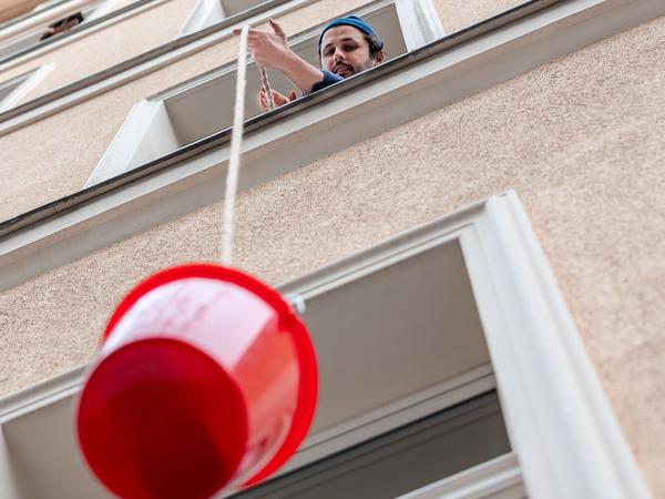 Längst eine Lokalberühmtheit ist der rote Eimer, den Christopher Selig regelmäßig aus dem Fenster seiner Wohnung am Zionskirchplatz abseilt. Darin sind seine viel gefeierten Ramen-Kits, die man bei ihm bestellen und zu Hause fertigkochen kann.