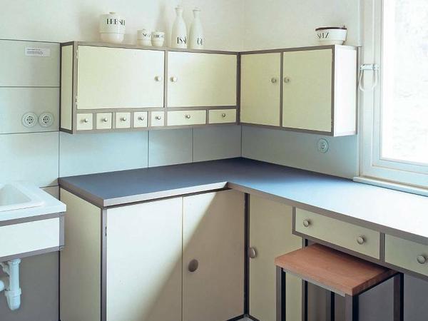 Auch das Bauhaus, das übrigens bemerkenswert wenig innovative Beiträge zum Thema Küche geliefert hat, zeigt 1923 in Weimar mit dem experimentellen „Haus am Horn“ von Georg Muche eine Küche mit durchgehender Arbeitsplatte über Eck und darüber angebrachten hängenden Oberschränken. Wir tun uns heute schwer, diese längst selbstverständlichen Ausstattungsmerkmale als Innovationen zu erkennen. Aber damals war es eine historische Neuerung. Noch ist die Spüle nicht integriert, sondern steht frei.