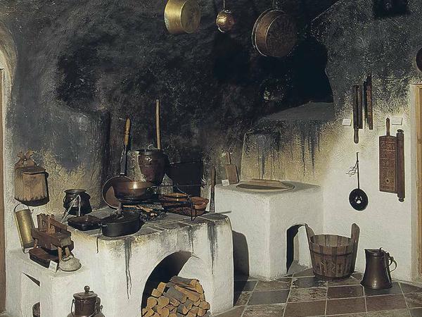 Wie kam es überhaupt zum abgeschlossenen Küchenraum? Die Geschichte der neuzeitlichen Innenarchitektur beginnt mit der Gestaltung und Möblierung sakraler und feudaler Gebäude und Räume. Profanbauten, bürgerliche oder bäuerliche Wohnungen, Wirtschaftsräume, Produktionsstätten und Verkaufsräume standen nicht auf dem Programm. Die Küche, die natürlich auch in Feudalbauten notwendig war, gehört zur sogenannten „Ökonomie“, ebenso wie Lagerräume, Ställe und Werkstätten – räumlich sowie personell vom Wohnen getrennt. Auch mit der Auflösung feudaler Strukturen und dem Aufkommen der bürgerlichen Gesellschaften im 19. Jahrhundert ändert sich daran zunächst wenig. Das Bürgertum in Stadt und Land überlässt Produktion und Haushalt dem Personal und behält damit, wenn auch in kleinerem Maßstab, die feudalen Traditionen bei.