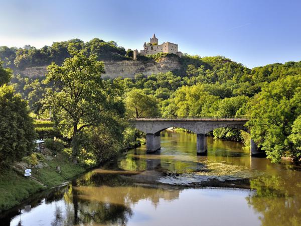 Genauso schön ist das Panorama von der Rudelsburg in der Stofftier-Stadt Bad Kösen am Ende des elf Kilometer langen Rundwegs. Die Festung thront auf einem Bergrücken aus Muschelkalk und zog schon im 19. Jahrhundert romantisch gesinnte Wanderer von weither an.