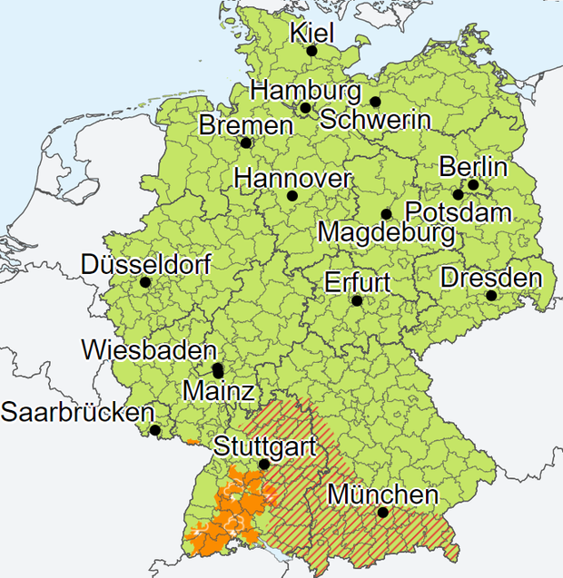Am Nachmittag seien laut DWD auch aus den Alpen heraus nordwärts heftigen Schauer und Gewitter mit Starkregen von 25 bis 40 Litern pro Quadratmeter in kurzer Zeit möglich. Punktuell könnte es auch zu Regenmengen von mehr als 60 Liter pro Quadratmeter in kurzer Zeit kommen.