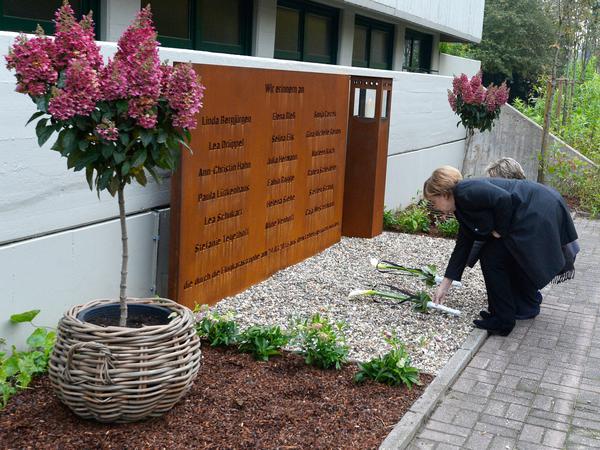Angesichts des "unfassbaren Unglücks" seien die Erinnerungsstätten an die getöteten Schüler und Lehrerinnen an der Halterner Schule "wundervoll gestaltet", sagte Merkel in ihrer Ansprache auf dem Schulhof. Zuvor hatte die Kanzlerin gemeinsam mit der nordrhein-westfälischen Vize-Ministerpräsidentin Sylvia Löhrmann (Grüne) an einem Gedenkmal für die Opfer auf dem Schulgelände jeweils eine weiße Lilie niedergelegt. Abgeschirmt von der Öffentlichkeit kam Merkel anschließend mit Schülern aus der Jahrgangsstufe der getöteten Gymnasiasten sowie mit Eltern der Opfer zu Gesprächen zusammen.