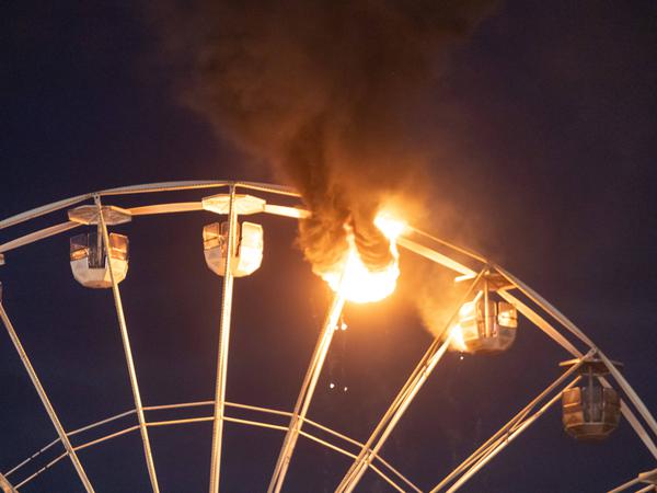 Gegen 21.00 Uhr war am Samstagabend zunächst eine Gondel des Riesenrads in Brand geraten. Dann griff das Feuer auf eine zweite Gondel über. Was genau in diesen Minuten geschah, versuchen die Ermittler noch zu klären.