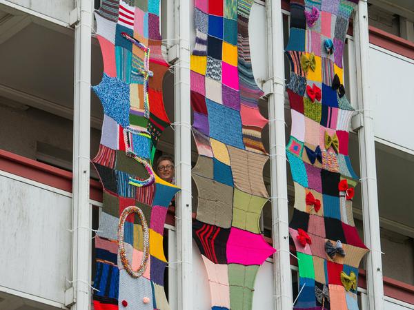 Eigentlich strickt die 52-jährige Brandenburgerin Katrin Berger mit ihrer Handarbeitsgruppe Socken und Babyjäckchen. Ihr neues Projekt ist eine Nummer größer: die Frauen haben sich einen DDR-Plattenbau in ihrer Stadt Forst an der Grenze zu Polen vorgenommen. Seit Kurzem zieren knallbunte Wollbahnen die Fassade des grauen Wohnblocks.