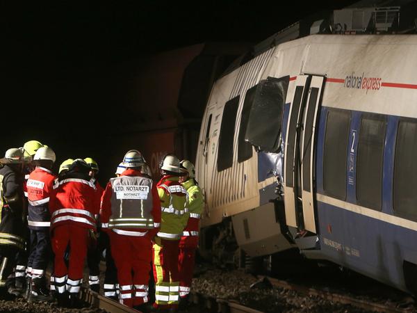 Auch Waggons des Güterzugs entgleisten. Der private Zugbetreiber National Express Rail richtete einen Schienenersatzverkehr ein. Das Unternehmen strich all seine Fahrten auf der Strecke. Im Stundentakt werden Busse zwischen Neuss und Krefeld eingesetzt. Die Deutsche Bahn rechnet trotz der Streckensperrung nicht mit Auswirkungen auf ihren Regionalverkehr. Die Bergungsarbeiten dauerten am Mittwoch an. Bis nach Mitternacht waren die Rettungskräfte mit der Evakuierung des Personenzugs beschäftigt. Eine abgerissene Oberleitung, die den Zug unter Strom setzte, erschwerte die Rettungsaktion zunächst. Die Reisenden mussten lange in dem Zug ausharren. Die Feuerwehr war nach eigenen Angaben mit mehr als 200 Einsatzkräften an der Unfallstelle. Der Lokführer des Regionalzugs verhinderte mit einer Vollbremsung Schlimmeres, so erste Erkenntnisse.