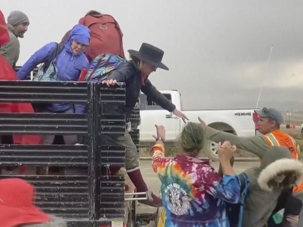 Montagmittag harrten noch 64.000 Menschen auf dem Gelände aus. Nach sintflutartigen Regenfällen am Freitagabend und Sonnabend hatte sich das Festivalgelände in ein riesiges Matschfeld verwandelt. Zehntausende Menschen saßen auf dem Veranstaltungsgelände in Black Rock City fest.