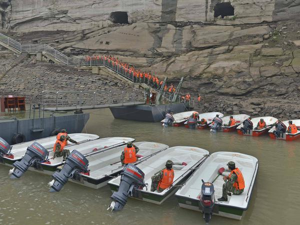 Rettungskräfte in China begeben sich in Rettungsbote. Ein Schiff mit mehr als 450 Menschen an Bord ist auf den Jagtse-Fluss gesunken.