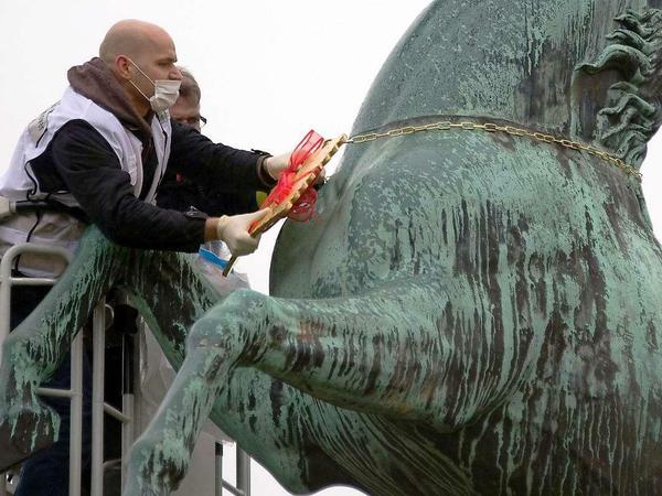 Gegen 8 Uhr kam der lang ersehnte Anruf. Jemand teilte der Polizei mit, dass das Pferd vor der Uni einen Keks um den Hals hängen habe. Bei dem Anrufer handelte es sich laut Polizei um einen „Passanten“. Mit Karabinerhaken und einer Metallkette war der Keks in rund fünf Meter Höhe am Hals des sogenannten Sachsenrosses befestigt. Offenbar hat der Keks leichten Schaden genommen, er sei ein wenig verbogen, heißt es. Kriminaltechniker nahmen mithilfe einer Drehleiter der Feuerwehr den Keks vom Pferdedenkmal. Um keine Spuren zu verwischen, arbeiteten sie dabei mit Mundschutz und Handschuhen.
