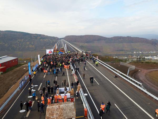 Mehrere Hundert Bürger waren zum Startschuss an das Bauwerk gekommen. Die Brücke ist Teil einer neuen, rund 25 Kilometer langen Strecke (B50 neu) zwischen Eifel und Hunsrück. Rund 25.000 Fahrzeuge pro Tag sollen sie pro Tag überqueren.