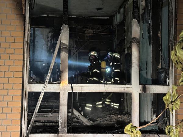 Eine Rußspur zieht sich bis zur obersten Etage. Nach dem Ende des Feuerwehreinsatzes war das Aufleuchten von Scheinwerfern in den betroffenen Zimmern zu sehen. Möglicherweise überprüften Feuerwehrleute, ob noch giftige Gase vorhanden waren, wie die Polizei erklärt. Allerdings waren auch Brandermittler vom Landeskriminalamt vor Ort. Zur Brandursache konnten die Beamten zunächst nichts sagen.