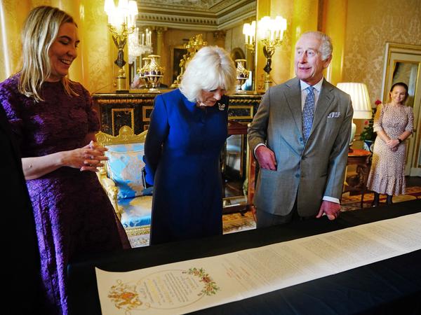 Kalligrafin Stephanie Gill arbeitete 56 Tage in Folge an der sogenannten Krönungsrolle, wie sie dem Paar bei der Übergabe im Buckingham-Palast sagte. Erstmals besteht die üppig dekorierte „coronation roll“ aus Papier und nicht aus Tierhaut – und spiegelt damit die Haltung des Königs zum Tierschutz wider.