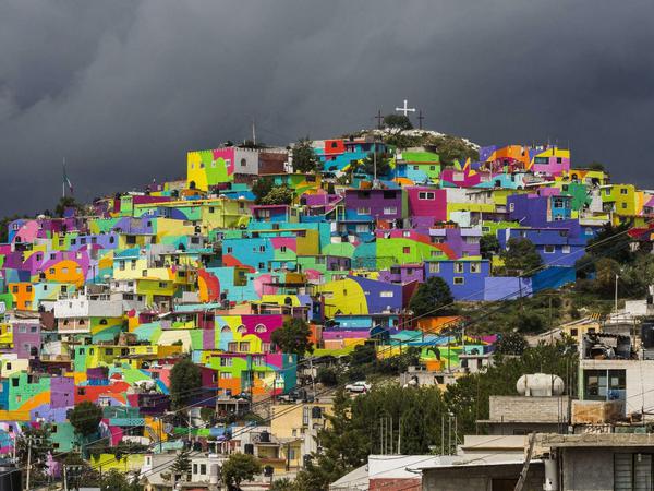 Noch vor kurzem galt der Stadtteil Palmitas im mexikanischen Pachuca als gefährlich: In den steilen Straßen etwa 100 Kilometer nordöstlich von Mexiko-Stadt bekämpften sich rivalisierende Jugendbanden, die Gegend war berüchtigt für ihre hohe Kriminalitätsrate. Doch dann malten Street-Art-Künstler mit Hilfe der Einwohner ein riesiges Wandbild auf die Häuser am Hang - und verwandelten das Armenviertel in eine Attraktion. Von weither bilden die Häuserfronten von Palmitas nun eine leuchtende, regenbogenfarbene Welle: Insgesamt erhielten in fünfmonatiger Arbeit fast 20.000 Quadratmeter Mauern und Wände einen bunte Fassade, darunter 202 Häuser von 452 Familien. Etwa 20 Einwohner wurden für das riesige Gemälde angestellt - nach Angaben des Rathauses das größte in ganz Mexiko.