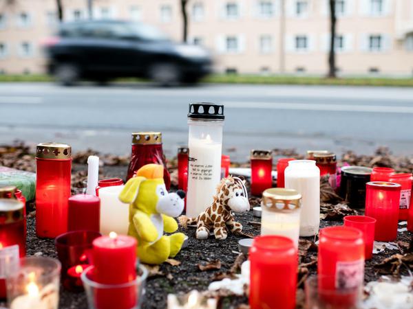 Im Herbstlaub an einer Kreuzung in München stehen Grablichter, daneben liegen Kuscheltiere und Blumen: Am Tag nach dem Raserunfall in München erinnern am Unglücksort Trauernde an den getöteten 14-Jährigen. Der Jugendliche starb am Freitagabend, als ihn an einer Ampel ein Raser erfasste. Gegen den Mann ist Haftbefehl wegen Mordes erlassen worden, wie ein Polizeisprecher am Sonntag sagte.