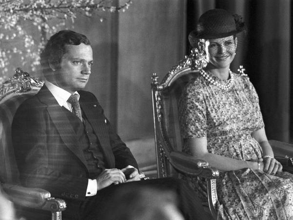 Die junge Silvia sitzt daneben, kichernd. „Ich finde, wenn du jemanden liebst, ist es egal, ob er der Chef einer Firma ist - oder ob er ein König ist“, sagt sie auf Englisch. Heute spricht sie fast perfekt Schwedisch. Eine Bürgerliche zu heiraten, war unter Königlichen damals im Gegensatz zu heute noch nicht gang und gäbe. Carl Gustaf macht es trotzdem: Am 19. Juni 1976 führt er seine Silvia im endlosen weißen Schleier und mit Diadem vor den Traualtar.