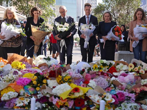 Ranghohe australische Politiker legen Blumen in Gedenken an die Opfer der Messerattacke in Sydney ab.