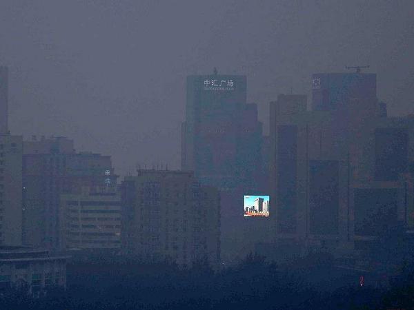 An diesem Tag im September 2014 durchdringt nur ein LED-Bildschirm den Smog in Peking.