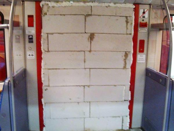 Die zugemauerte Wagentür einer S-Bahn in Hamburg.