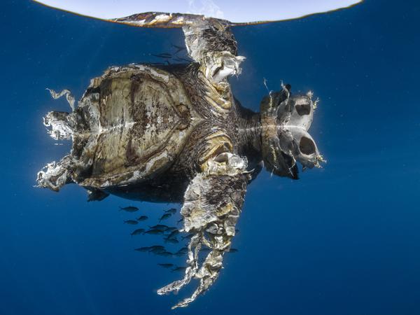 „Die Leiche einer Meereschildkröte bietet einen Einblick in Leben und Tod im offenen Ozean. Die Schnittwunden am Panzer der Schildkröte waren ein klarer Beweis dafür, dass sie durch einen Bootsanschlag umgekommen ist. Der verwesende Körper der Schildkröte wurde schnell als Zufluchtsort für Jungfische genutzt.“