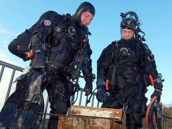 Bei vier Grad Wassertemperatur können die Taucher am Dienstag nur eine halbe Stunde unten bleiben. Da plötzlich leuchtet ein heller Kasten im Lichtkegel der starken Unterwasserlampen. Ein kleiner Safe, etwa 40 Zentimeter hoch. Wenig später hängt er am Haken einer Kranwinde. Die Taucher steigen aus den Fluten, entkräftet. „Wer auch immer die Tresore hier versenkt hat - es ist schon ungewöhnlich, so viele in einem Suchgebiet zu finden“, sagt Polizeisprecher Dietmar Trust. Vielleicht sei hier der Stamm-Abladeplatz einer Tätergruppe, die bei Nacht und Nebel ihr ausgeschlachtetes Diebesgut habe loswerden wollen.