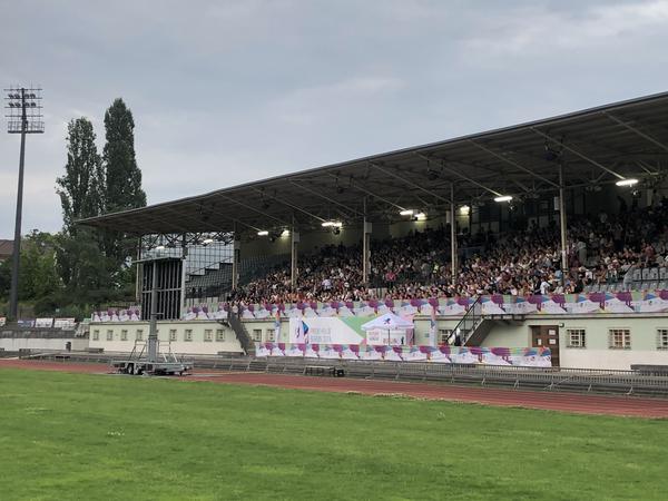 Public Viewing mit echter Stadionatmosphäre? Das bietet bei dieser Fußball-EM das Pride House im Berliner Poststadion an. Hier sitzen die Fans auf der Tribüne und schauen auf den Rasen – ganz wie beim richtigen Spiel, nur dass auf dem Rasen der große Screen mit der Fußballübertragung steht.