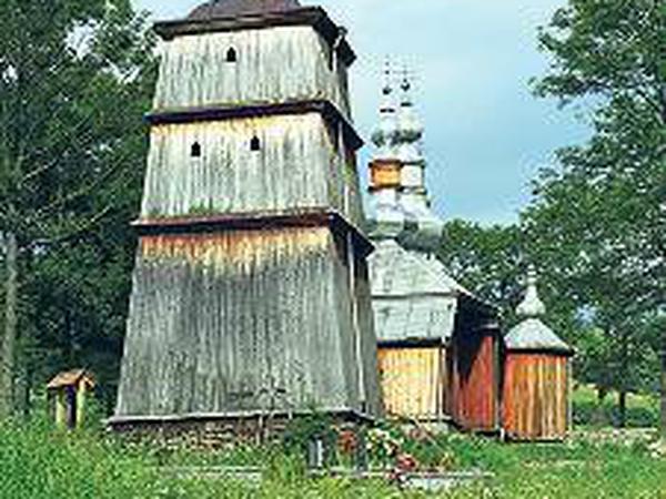 Oben lichtet sich der Wald zu einer Wiese, ein uriges Kirchlein mit verwitterten Holzschindeln und einem dreigliedrigen Zeltdach erwartet uns. Es erinnert an die bescheidene, aber gleichzeitig fantasievolle Bauweise der Boiken. Der Eingang rundet sich wie ein riesiges Fass, das Holz duftet eigentümlich süß nach dreihundertfünfzig Jahren Geschichte. Kyrillisch beschriftete Grabkreuze stehen einträchtig neben anderen mit lateinischen Buchstaben: Zwei Ukrainerinnen sind beide 1946, also noch vor der „Aktion Weichsel“, gestorben. Aber die Kreuze auf ihren Gräbern sind neu, als hätte jemand ein Zeichen dafür setzen wollen, dass endgültig Frieden eingekehrt ist zwischen Polen und Ukrainern.