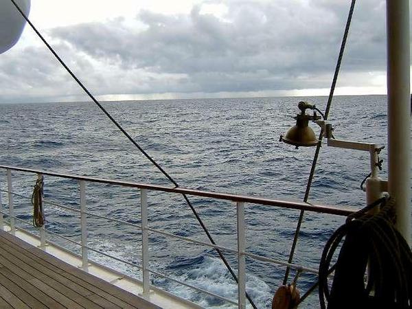27 Grad und jede Menge Regen: Die feuchte und warme Luft schmeichelt der Haut, es ist prima auszuhalten an Deck. Aber die Sonne lässt sich heute nur kurz sehen. Gleich zwei Regenbögen rahmen sie zu ihrem Aufgang ein. Augenärztin Bärbel aus München hat am Vormittag einen prima Einfall. Eben habe ich mich mit dem Mexikaner Luis auf eine vor dem Regen geschützten Bank hinter der Lounge etwa in der Mitte des Schiffes gesetzt, da schlendert Bärbel vorbei und fragt uns zur besten Brunchzeit: „Trinkt Ihr ein Glas Champagner mit mir?“ - Tja, warum eigentlich nicht? Wir haben heute ja nichts mehr vor, die Besichtigung der Tischlerei und der Segelmacherei im Vorschiff liegt ja gerade hinter uns.