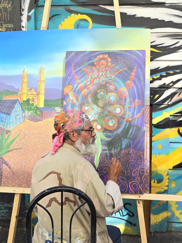 Wir haben Glück und können Künstler beim Malen beobachten. Gearbeitet wird im Kollektiv, wird jemand nicht fertig, malt ein anderer weiter. Und gibt es etwas Leerlauf, werden über einem Gasbrenner Kartoffelscheiben zu Chips frittiert.