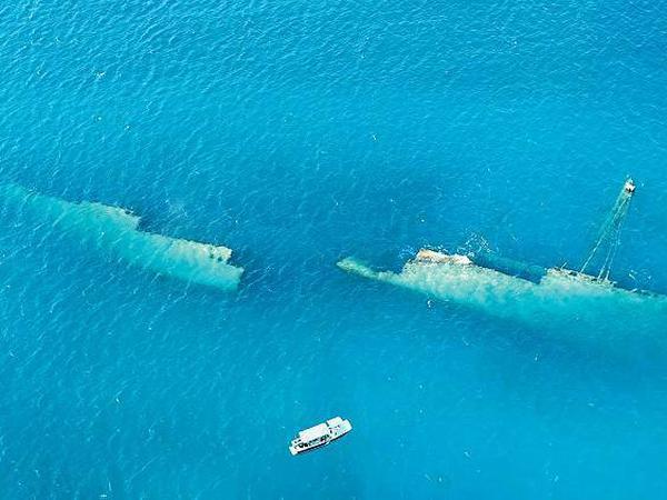 Toll! Eine Echte Karettschildkröte schwebt gemächlich vorbei, scheint jedoch keinerlei Notiz von uns blubbernden Wesen zu nehmen. Ihre Aufmerksamkeit gilt wohl eher einem tonnenschweren Tigerhai, der elegant durch sein Revier gleitet. Wir lassen uns auf 16 Meter unter Null durchsacken. Die leichte Unterwasserströmung treibt uns unserem Ziel entgegen. Schon werden gigantische Konturen sichtbar, einer überdimensionalen Wand gleich. Dieser Koloss aus Stahl reicht vom Meeresgrund in 18 Metern Tiefe bis zur Wasseroberfläche – und dies auf der Seite liegend. Schnell erkennen wir Details.