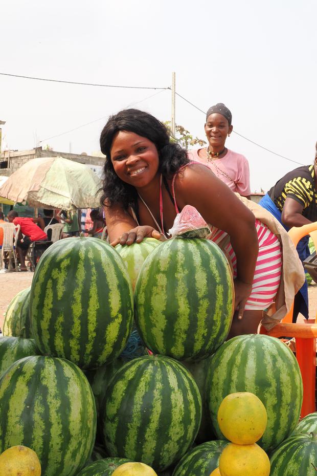 Die Realität sieht anders aus. Der Verkaufsplatz gleicht einer Müllhalde. Auf dem sandigen Boden mischen sich leere Wasserflaschen und Chipstüten mit organischen Abfällen. Ein LKW-Fahrer winkt aus dem Seitenfenster eine Frau herbei, um Brot zu kaufen. Einige Frauen sitzen auf Plastikstühlen, manche stehen. Vor sich oder auf dem Kopf präsentieren sie ihre Waren. Obst, Backwaren, gekochte Bananen.