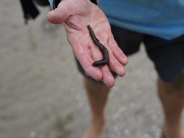 Auch Nummer vier bekommen wir zu sehen. Matthias schnallt den Dreizack vom Rucksack ab und rammt die Zinken in den Boden. Er muss nicht lange graben, um einen Wattwurm in der Hand zu halten. Das Tier lebt in einer U-förmigen Röhre, zu jedem Wattwurmringel gibt es einen kleinen Krater, in dem es den Sand ansaugt, um ihn zu filtern und, um winzige Algen erleichtert, wieder ausstößt. Nur die Nordseegarnele verpassen wir – die kennen wir allerdings schon vom Krabbenbrötchen.