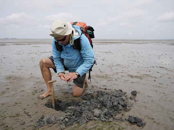 Die Wanderung beginnt bei ablaufendem Wasser, noch steht es knöcheltief auf dem Watt. Im zügigen Schritt von jemandem, der einen genauen Zeitplan im Kopf hat, geht Matthias voran mit Rucksack, Sonnenhut, Sonnenbrille und, zum Graben, einem Dreizack, der genau genommen ein handlicher Vierzack ist – Standardausstattung eines jeden Wattwanderführers.