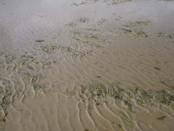 Der Weg führt über festes Sandwatt, anders als im Schlickwatt sinkt man gar nicht ein. Die Füße massiert es trotzdem. Wenn das Wasser der Nordsee hier auf- und abläuft, zwei Mal am Tag, spült es den Sand am Boden so hin und her, dass er in kleinen Wellen liegen bleibt. Je weiter das Wasser abläuft, desto mehr Seegras und Wattwurmringel kommen zum Vorschein.