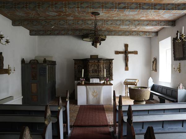 Wie eine sanfte Rampe fällt die Warft zu den Wiesen hin ab. Mit akkuraten Zäunen haben die Bewohner ihr knappes Territorium abgesteckt. 18 Häuser stehen dicht gedrängt wie eine Wagenburg um den Fething, den Teich, in dem das Trinkwasser fürs Vieh gesammelt wird. Wir schauen in die kleine Backsteinkirche, die 1824 gebaut wurde und gleich im ersten Jahr knietief unter Wasser stand, trotz der erhöhten Lage. Die Einrichtung wurde aus anderen Kirchen zusammengetragen, die bei den großen Sturmfluten in der Vergangenheit untergegangen sind.