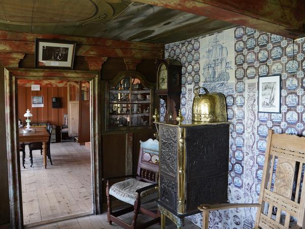 Boysen setzt uns auf der Ketelswarft ab. Im Kapitän-Tadsen-Museum, einem hübsch herausgeputzten Backsteinhaus mit Reetdach, bekommt man einen Eindruck davon, wie das Leben auf der Hallig im 19. Jahrhundert war – für die Besserbetuchten. Das Haus hat sich ein Kapitän gebaut, der in der Zeit der Walfänger zu Wohlstand gekommen war, zu erkennen an den vielen kunstvoll bemalten holländischen Fliesen. Bis 1982 lebten Nachkommen in dem Gebäude, die letzten verließ es während einer dramatischen Sturmflut. Der Abreißkalender im Flur zeigt bis heute den 23. November an.