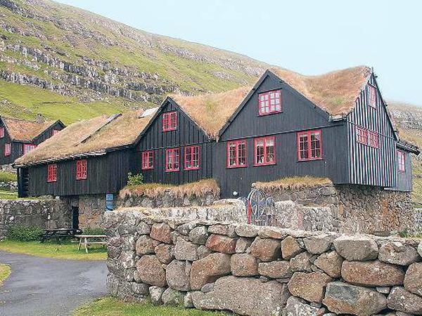 Gleich hinter der soliden Friedhofsmauer erhebt sich eines dieser wuchtigen Bauernhäuser, die aus schwarz geteerten Baumstämmen gezimmert wurden. Ist das tatsächlich Holz? Und wo kommt das dann her? Schließlich wächst auf den Färöern wohl seit den Zeiten der Wikinger kein Wald mehr. Holz ist hier so wertvoll wie andernorts Edelmetall.