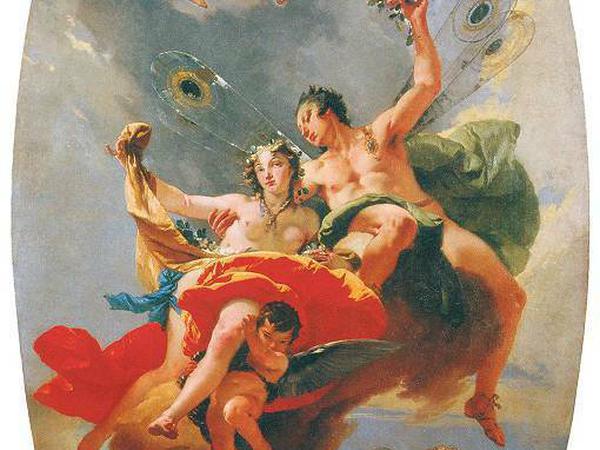 Vor allem aber hat Tiepolo Paläste und Kirchen ausgemalt, hat biblische und mythologische Szenen dargestellt, ohne im Schwung seines Pinsels, in der Grazie seiner Linienführung, in der Helligkeit seines Kolorits Unterschiede zu machen. Tiepolos Kosmos ist duftig und heiter, ein ewiges Schweben, ist Anmut und Bewegung. So wollte sich Venedig im 18. Jahrhundert dargestellt sehen.