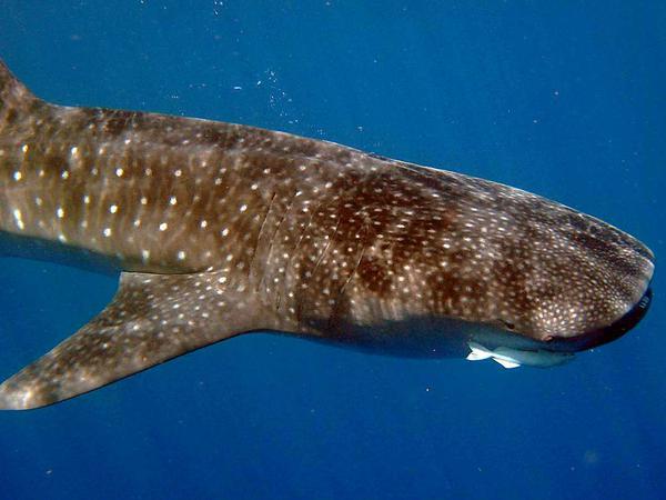 Schwebt er oder schwimmt er? So groß und ruhig wie er durchs Wasser gleitet, mutet der Walhai wie ein Luftschiff an. Nur ab und zu schwingt er sich kaum sichtbar seitwärts voran. Seinen massigen Körper bedecken Bambiflecken, und sein Maul ist leicht geöffnet. Ganz so, als wollte er freundlich signalisieren: Ich tue niemandem etwas, ich fresse nur Plankton und kleine Fische – obwohl ich Flossen wie ein Hai habe.