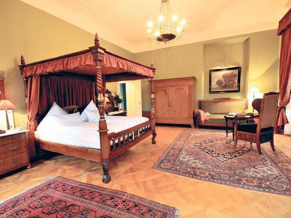 Die Privatgemächer der Familie bleiben den Hotelgästen natürlich verschlossen. Doch es ist ja so viel Platz im Schloss. Der anmutige Spiegelsaal kann durchschlendert werden, der Kaminsaal, der nicht enden wollende Flur im ersten Stock. 13 Zimmer und drei Suiten stehen zur Verfügung. Jeder Raum ist anders eingerichtet, mit wertvollen antiken Möbeln. „Wir haben auf den Dachböden unserer Familien gestöbert und Sachen gefunden, die hervorragend ins Schloss passen“, sagt Marlies Brühl-Pohl. Nur die Himmelbetten sind Nachbauten, die antiken wären schlicht zu kurz. Weinrot, senfgelb, tannengrün oder taubenblau sind die Wände in den Zimmern. „Jede Zeit hat ihre Farbe“, sagt der Graf. Und damit sie stimmig eingefangen wurde, hat man die Farben gleich in England bestellt, wo historisches Erbe akribisch konserviert wird. Auch die Badezimmer zeugen von Wanne und WC bis hin zu den Armaturen vom englischen Stil.