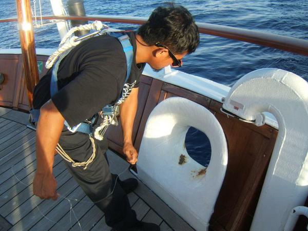 Bei strahlendem Sonnenschein ist die Crew mit Wartungsarbeiten beschäftigt: Sie schleifen Metallteile ab und überziehen sie mit einem Schutzanstrich gegen Rost, die Taue zum An- und Ablegen werden mit einem Heizluftgebläse abgeflammt, damit sich die vielen kleinen hochstehenden Polyesterhaare wieder mit dem Zopf verbinden. In Handarbeit werden Teile der hölzernen Deckaufbauten abgeschmirgelt und anschließend neu gestrichen.