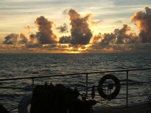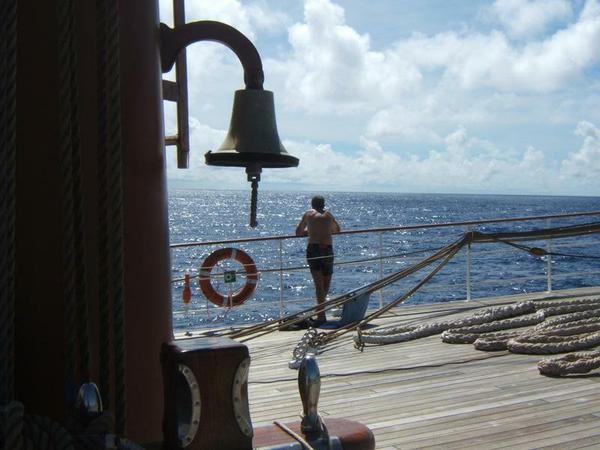 Mann, ist das schwül heute! Das Wasser läuft ja aus den Schuhen. 28 Grad Celsius beträgt die Lufttemperatur, die Luftfeuchtigkeit ist enorm: Ruck-Zuck sind wir klatschnass. Heute lässt die Karibik aber wirklich grüßen. Und so hilft nur ein Sitzplatz im Schatten weiter. An Deck riecht es nach Messingpolitur.