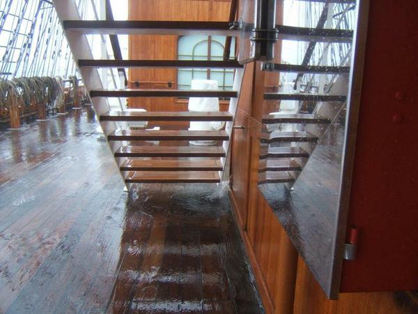 Kurz gesagt: Man tritt den Rückzug an. Und das galt heute für alle an Bord. Da sind die „Deckhands“, die das Regenwetter nutzten, um die Treppen an Deck im Rückwärtsgang zu schrubben. Da sind die „Rigger“, die erst Segel hochziehen, um sie dann ein paar Stunden später mitten im warmen Sturzregen wieder einzuholen (Flaute!). Und da sind die Passagiere, die sich mit einem guten Buch ins innere Gehäuse zurückziehen. „Man muss sich anfreunden mit diesem ,Nichts'“, sagt Marlies, die die Transatlantiküberquerung mit ihrem Mann Helmuth bei der letztjährigen Tagesspiegel-Weihnachtsauktion ersteigert hatte: „Es hat etwas von Retreat – ich bin die vergangenen zwei Monate wie auf Hochtouren gelaufen", sagt sie. „Und nun ist es wie im ,Zauberberg' – auf diesem ,Zauberschiff.'“