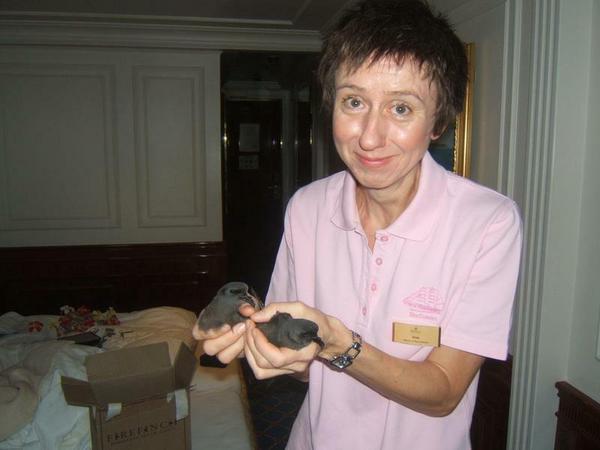 Wie gut es doch die Vögel haben, die – wohl während ihres Rückfluges - vor einigen Tagen völlig entkräftet an Deck aufgefunden wurden! Zwar gibt es Stimmen, die sie am liebsten über Bord sehen würden, doch das Herz für Tiere hat sich in der Crew durchgesetzt. Zwei Vögel hat die Mannschaft auf dem Vordeck unter ihre Fittiche genommen, zwei kommen in den Genuss der geballten Wellness-Kräfte unserer Spa-Fachfrau Ursula („Urs“).