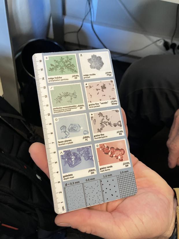 Schnee, auch das lernt man bei Roumier, hat deutlich mehr Erscheinungsformen als die sternförmigen Kristalle, die vom Himmel fallen. Druck und Temperatur formen unterschiedlichste Gebilde. Aus Sicht der Lawinenforscher kann man vereinfacht sagen: eckige, an Salz erinnernde Formen sind eher gefährlich, splitteriger oder kugelige Gebilde eher stabil. Und heute? Roumier klemmt sich das kleine Mikroskop vors Auge. „Irgendwo zwischen kugelig und splitterig.“