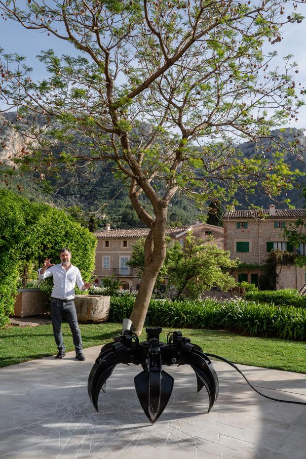 Und doch wirkt das „Ding“ in seiner Brutalität irgendwie hilflos: Beim Versuch, das dritte Bein anzuheben, fällt es um und liegt nun wie ein Käfer auf dem Rücken, unfähig, sich wieder aufzurichten – bis sein Schöpfer, der italienische Künstler Arcangelo Sassolino, der zur Eröffnung nach Deià gekommen ist, ihm zur Hilfe eilt.