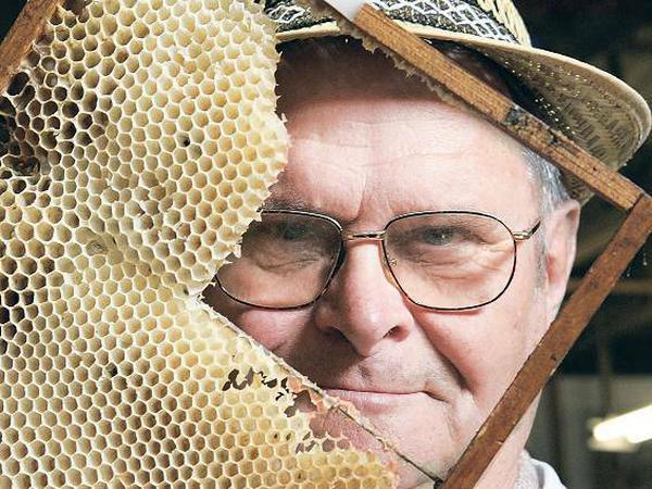 In einem Gläschen bewahrt er ein paar Exemplare der nur wenig mehr als einen Millimeter großen Varroamilbe auf, die – mit oft tödlichem Ausgang – nicht nur auf erwachsene Honigbienen geht, sondern auch auf Bienen in der Zelle, die ausgeschlüpft dann kleiner sind und deren Lebenserwartung deutlich reduziert ist. 1983 hat Kraatz den Parasiten, der Ende der 60er Jahre erstmals in Europa nachgewiesen wurde, unter seinen Bienenvölkern entdeckt.