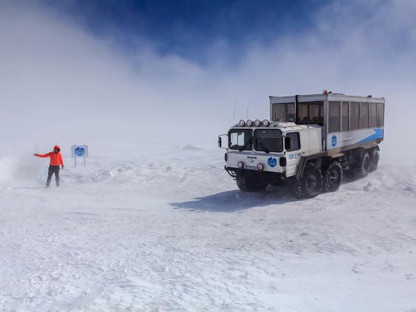 Adrian Pop ist geborener Rumäne und daher kein unmittelbarer Magieexperte. „Dracula“, sagt er, wenn man ihn nach übernatürlichen Wesen fragt. Dafür ist Pop Spezialist für Gebilde, die sich auf Island seit Jahrtausenden züngelnd fortbewegen: Gletscher. Der Experte steht, einen Tag nach dem Besuch bei Bauer Harðason, an Bord eines Raketenwerfers, der irgendwann umfunktioniert wurde, um Touristen aus dem Dorf Húsafell aufs ewige Eis zu transportieren, genauer: auf den Langjökull, einen der mächtigsten und beeindruckendsten Gletscher der Insel, 20 Kilometer breit, 55 Kilometer lang. Wenn man ihn nur sehen würde!